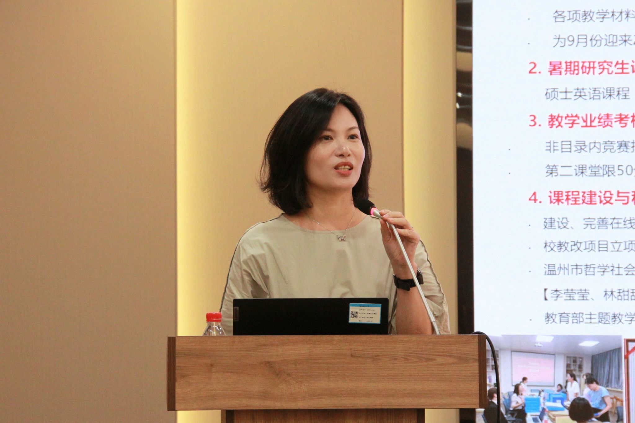 随后,章艳乐副院长作暑期工作通报及学期初工作报告。她从教学科研、师资培训、社会服务等方面对暑期工作进行通报,重点部署了新学期教学工作。她强调全院教职工要严格按照学校的要求做好本科教育教学审核评估工作,凝心聚力、笃行实干,抓住机遇、乘势而上,持续推动学院高质量发展。