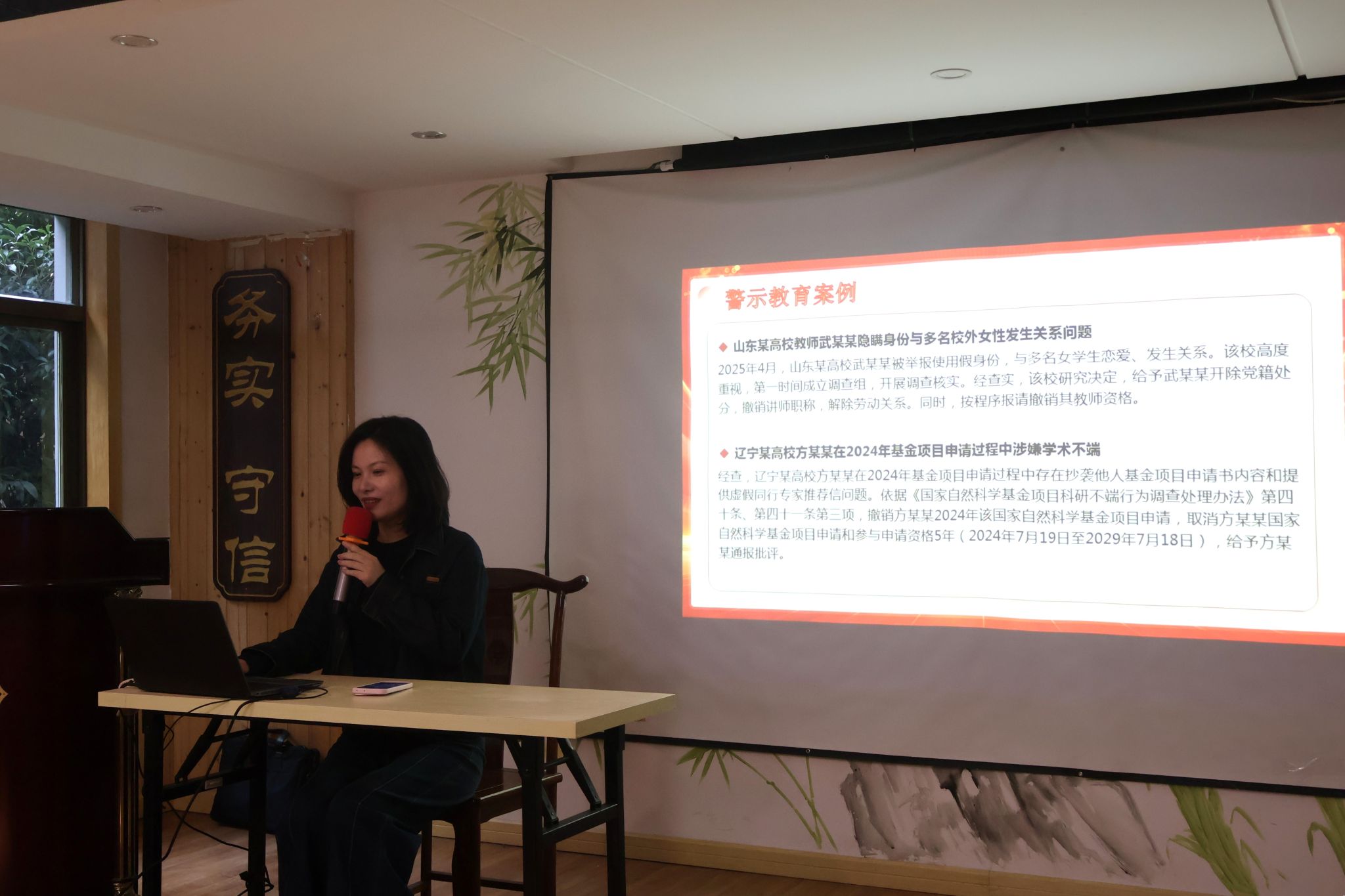 学院副院长章艳乐结合二十届四中全会精神中关于全面从严治党的要求,通过警示教育案例,深入浅出地阐述了师德师风建设的重要性。她要求全体教师以案为鉴,时刻自重、自省、自警、自励,坚守立德树人初心,恪守学术规范,坚决抵制学术不端行为,共同营造风清气正的育人环境和求真务实的科研氛围。
