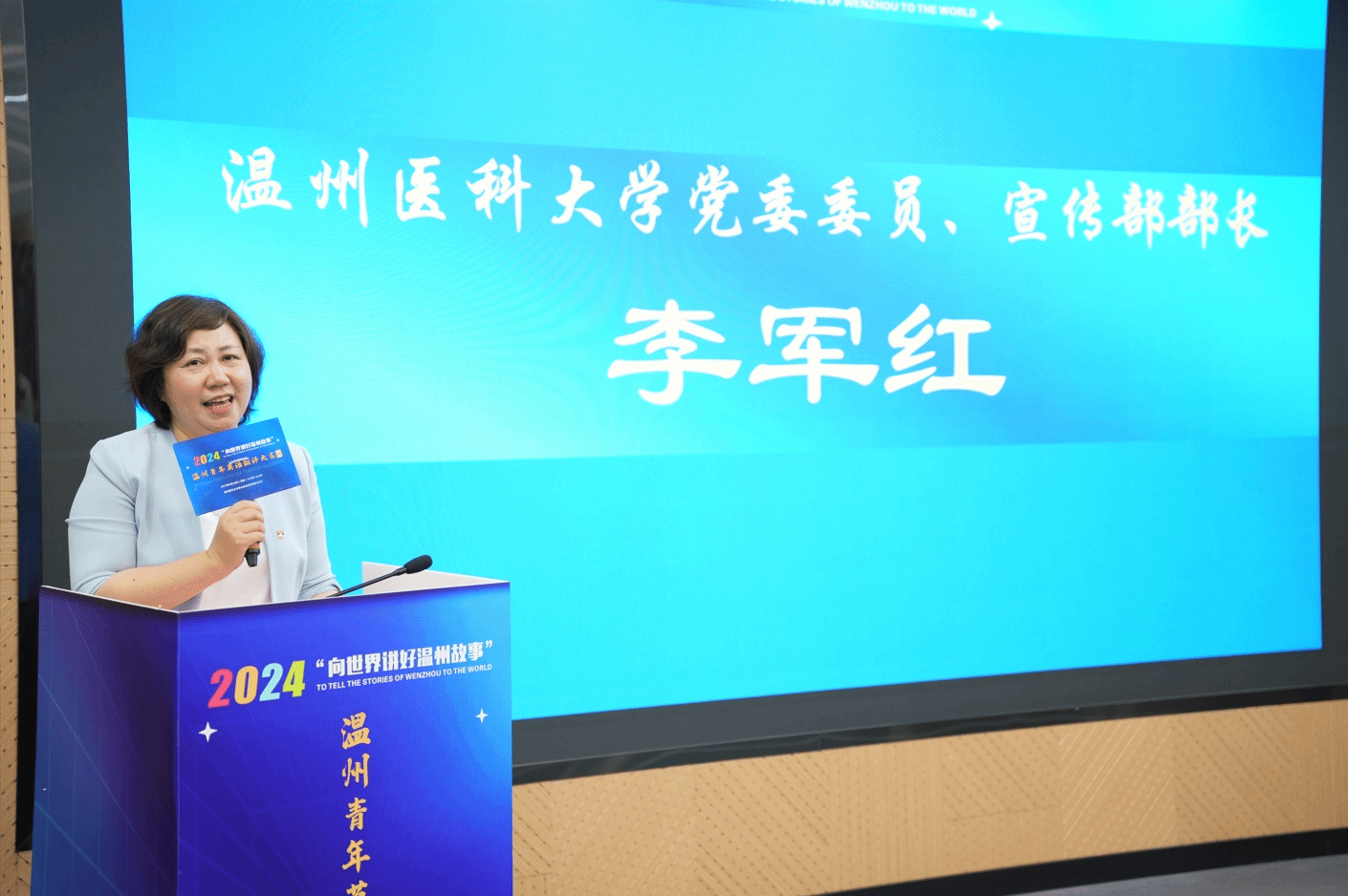党委委员、宣传部(教师工作部)部长李军红首先对大赛的成功举办表示祝贺,并对所有承办单位和工作人员的辛勤付出表示衷心感谢。她表示,本次赛事不仅是一场高水平的英语翻译竞赛,更是对外展示温州形象、传播温州声音的重要窗口。她希望通过这次比赛激发更多青年人,用智慧和才华向世界传递温州声音、讲述温州故事;同时也能培养更多优秀的青年翻译人才,为温州的国际化发展贡献力量。