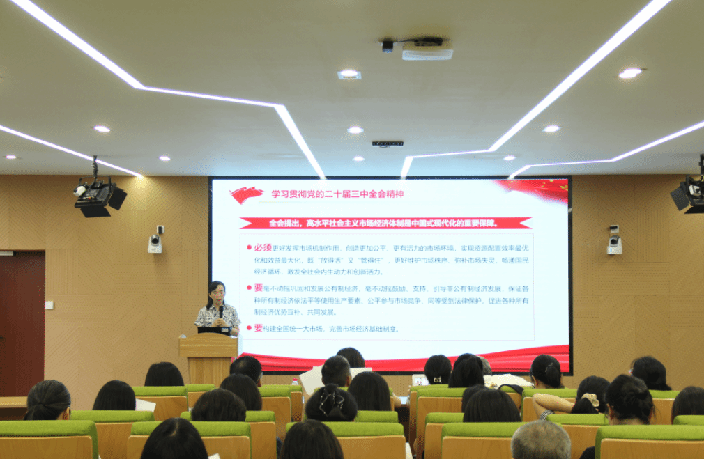 会议传达学习了二十届三中全会精神。刘洁详细解读了党的二十届三中全会精神,对新时代以来全面深化改革的成功实践和伟大成就、进一步全面深化改革的总目标、进一步全面深化改革做出的系统部署进行了阐释。她指出,党的二十届三中全会,是在以中国式现代化全面推进强国建设、民族复兴伟业的关键时期举行的一次十分重要的会议,学习贯彻好党的二十届三中全会精神是当前和今后一个时期全党全国的一项重大政治任务,学院全体党员教师要切实增强进一步全面深化改革的政治责任感和历史使命感。