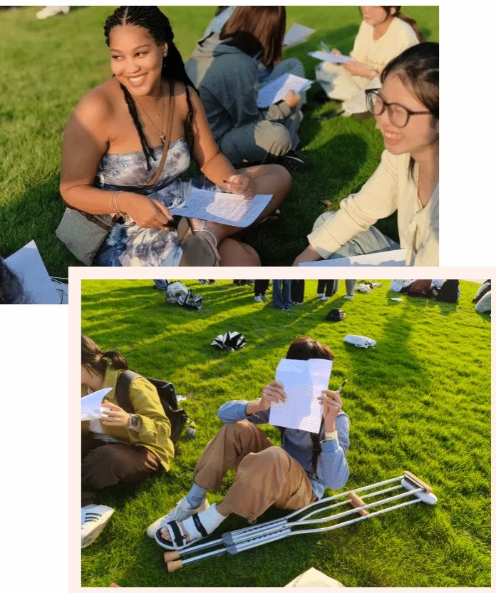 在热身游戏结束后,大家便开始挑战组内的社交活动。参考提供的九个关于”大学生活“的小问题,分别向组内不同的同学提问,得到答案后邀请对方签字,这很好地鼓励了同学们主动和更多的人聊天,促进了组员间更深刻的交流。