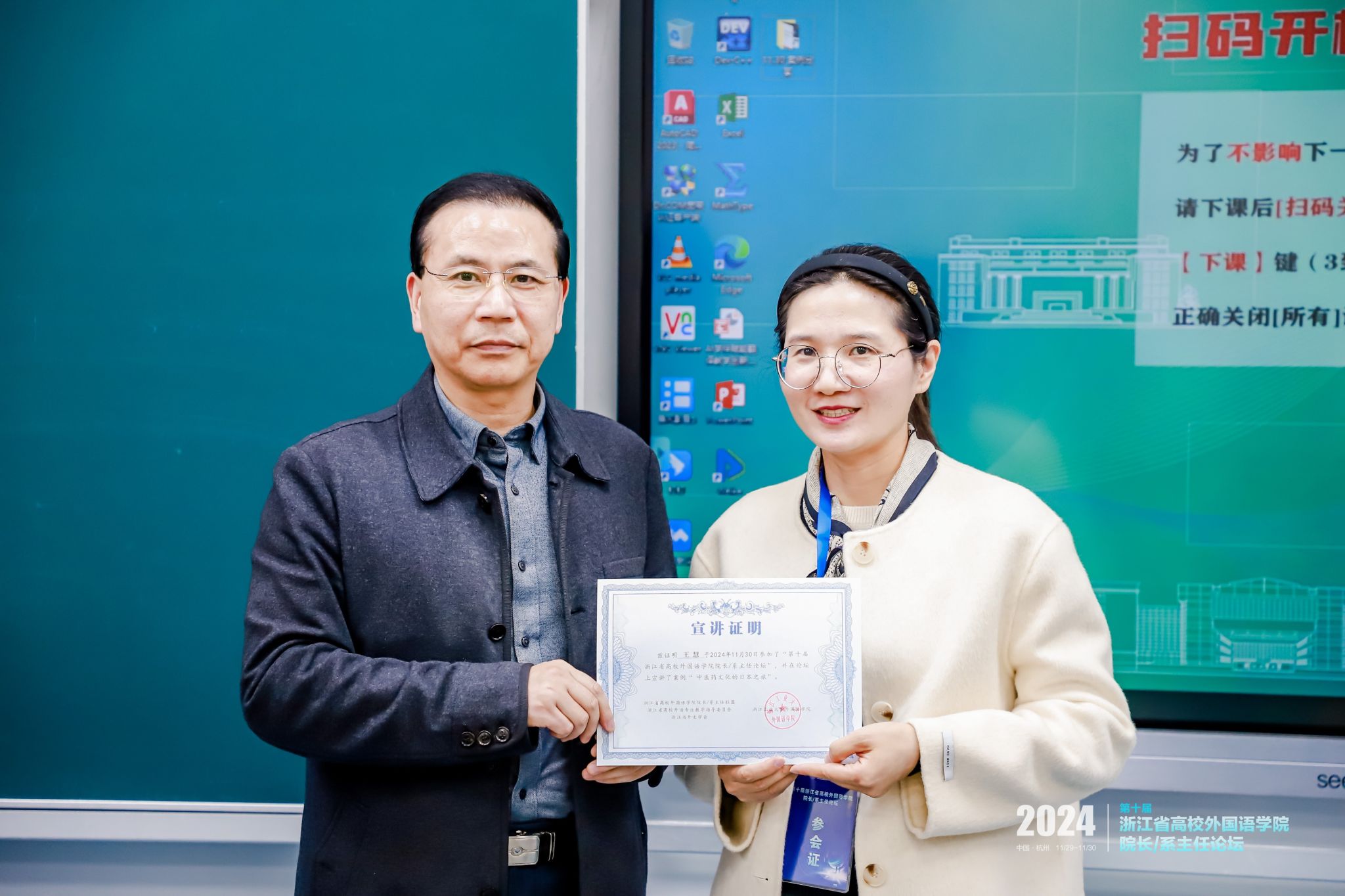 王慧副主任参加了第三分论坛“数智赋能外语课程首批优秀案例展示”,并宣讲了案例《中日传统医史知识图谱课程建设:构建要素的规划与设计》。她深入挖掘中日传统医史中的关键知识点,并强调利用现代数智技术手段为学生提供更高效的学习体验。