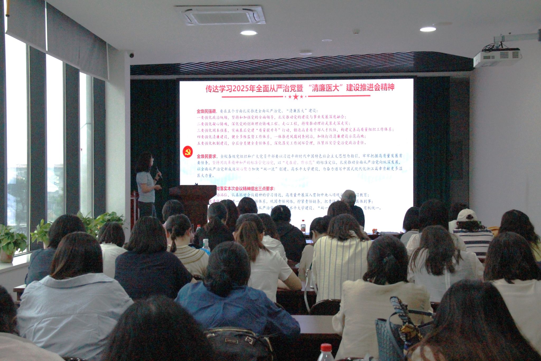 2025年全面从严治党暨“清廉医大”建设推进会精神,解读学校2024年纪检监察工作要点,总结回顾过去一年学院全面从严治党工作,研究部署推进“清廉学院”建设工作。