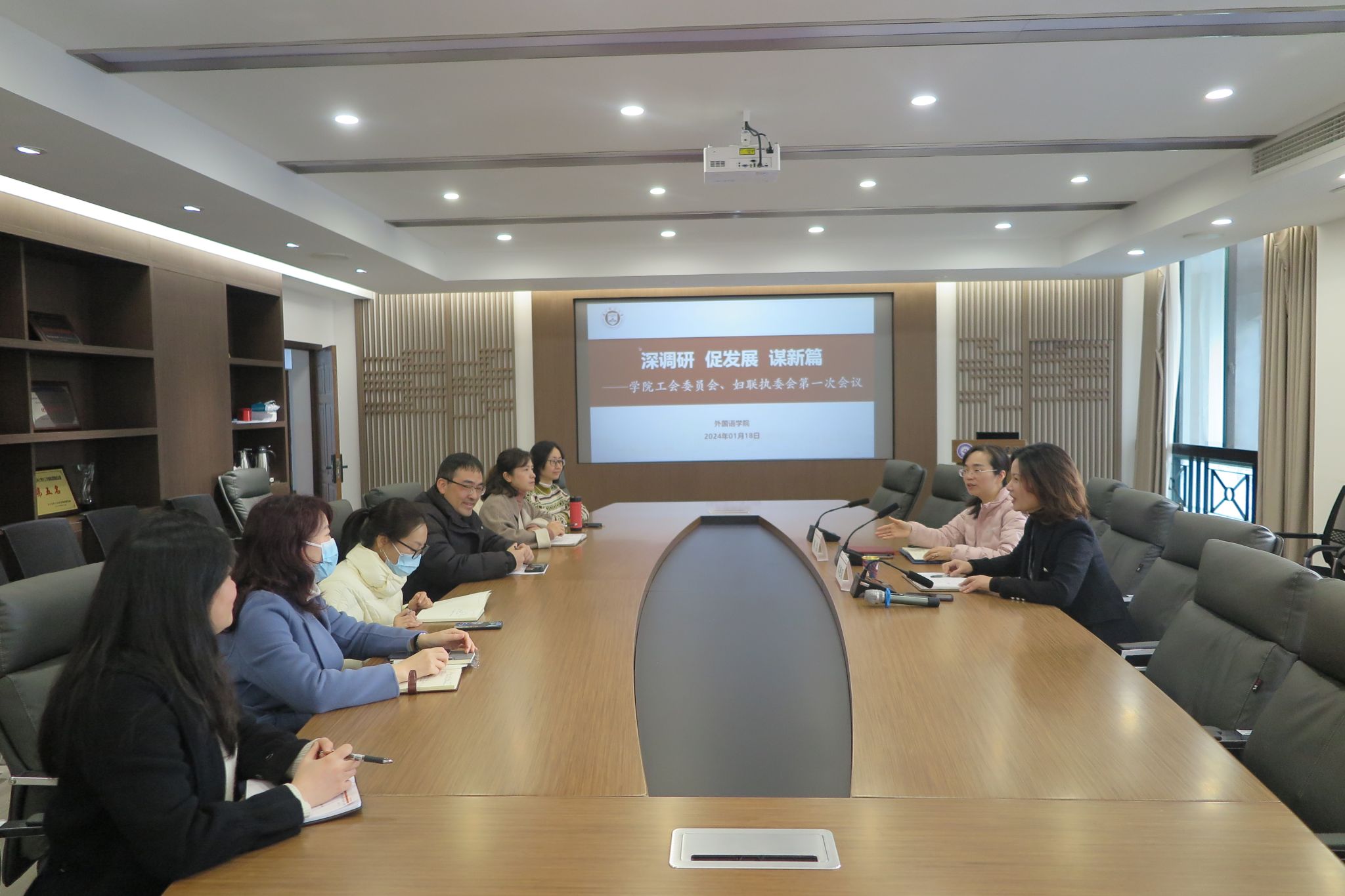 1月18日上午,2024年中文AV 工会委员会、妇联执委会第一次会议在7B104会议室召开。学院书记刘洁、副院长章艳乐、工会委员会成员、妇联执委会成员参加了会议。