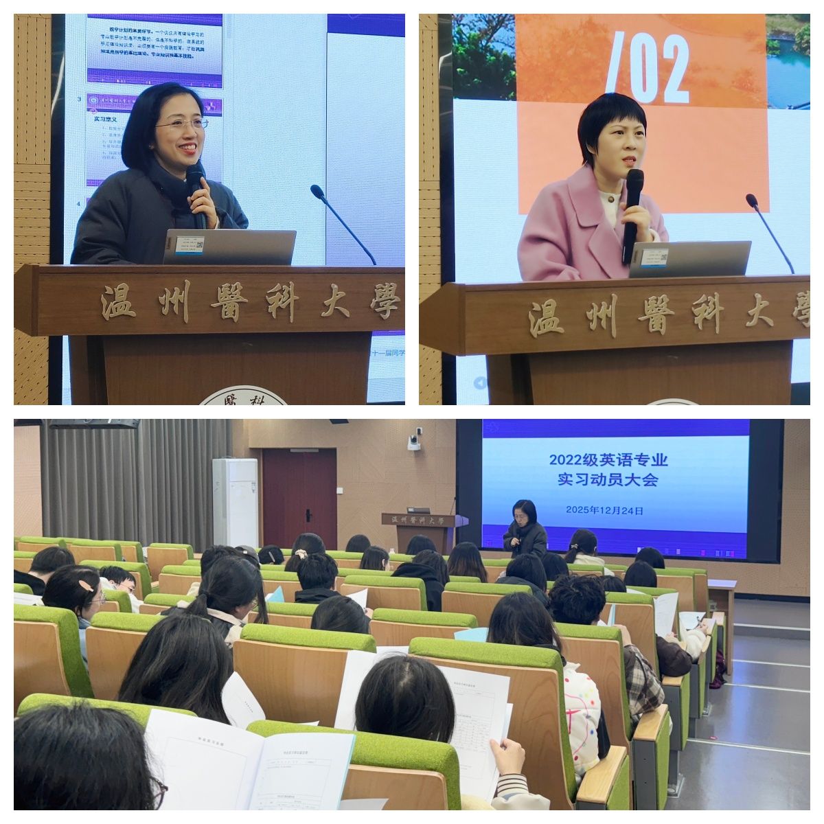 会议伊始,章艳乐副院长作动员讲话。她强调,实习是外语专业学生将理论知识转化为实践能力的关键环节,更是助力专业成长、明晰职业方向的重要契机。她向同学们提出四点殷切期望:一是坚守学习初心,保持谦逊态度,在岗位实践中汲取经验、增长才干;二是锤炼专业素养,以严谨细致的作风履职尽责,以专业、敬业、乐业的态度展现温医学子的良好风貌;三是严守纪律底线,遵守实习单位规章制度与管理要求,时刻绷紧人身与财产安全之弦,及时与指导老师、辅导员沟通;四是平衡实习与学业,合理规划时间,按时完成毕业论文阶段性任务,做到实践与学业双线并进。